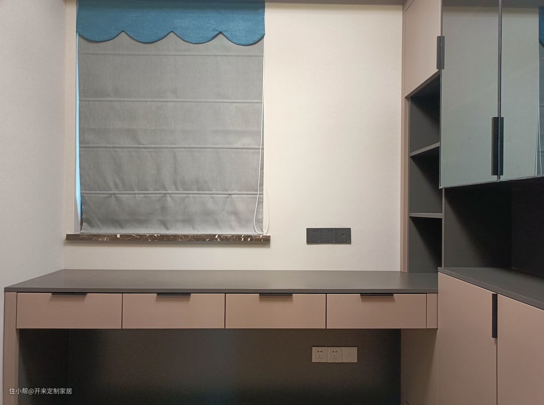1 开架区延伸书桌是较为实用也美观的设计法则,悬浮抽屉做书桌兼分类收纳,开架区做书架开放展示,上下方吊柜地柜提供隐藏式不常用及常用物收纳层。