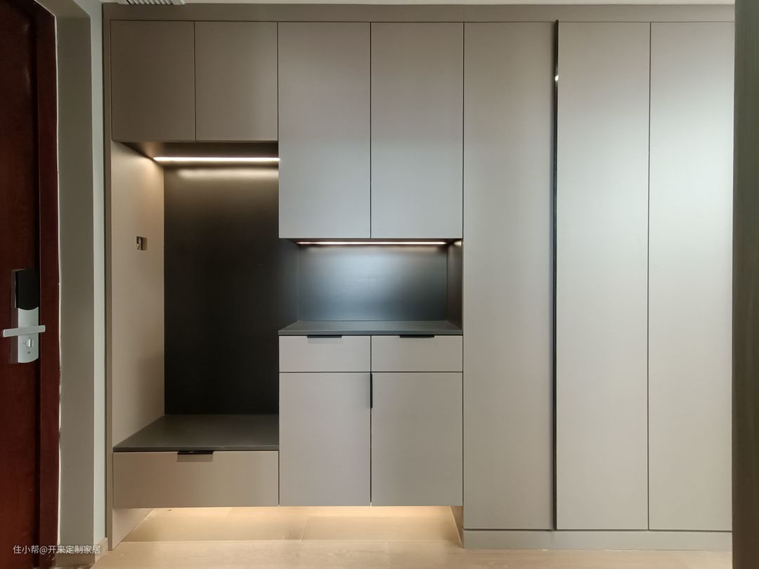 6 玄关柜底部留空作为常位鞋,错落有序的抽屉与悬浮矮柜构造卡座与置物台区,留空背板可设挂钩打造挂放区,灯带增添光晕与温馨,浅咖一体色视觉舒适。