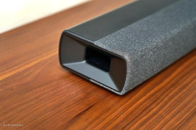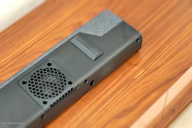 音响背部居中凹槽为接口区域,除蓝牙5.0无线连接外,其机身保留了Aux模拟信号输入、数字光纤输入、HDMI输入、HDMI eARC输入等多种输入接口,以及低单独的低音炮输出接口。
