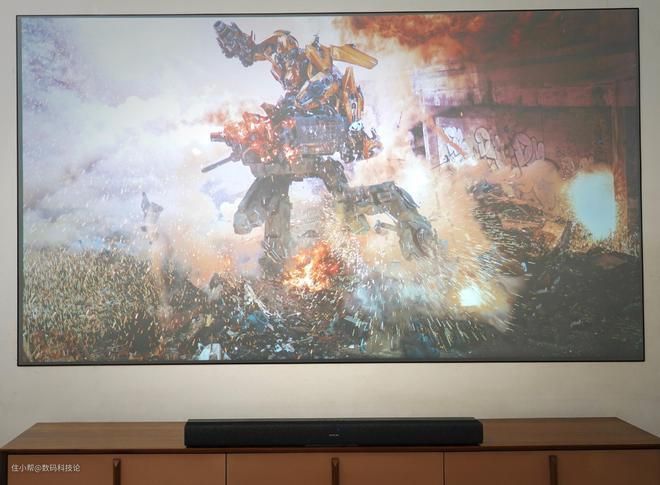 另外从摆放方位来说,长焦的智能投影仪,一般是摆放在茶几或者与沙发平行的沙发角几上使用,本身距离观看者很近,这就导致画面虽然是在2~3米之外呈现,但所有声音都是近在咫尺的距离上,再好的音效也释放不出超强立体声的效果。但如果是用回音壁播放,屏幕与回音壁基本同位置,在关灯看电影的时候,人的专注点就会放在一处,很容易给人一种身临其境的感觉。