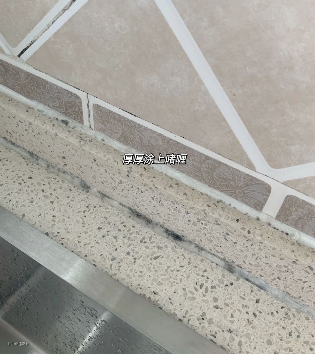 厨房台面常见明水,导致玻璃胶缝隙常常发霉,但,除霉又真的是老大难。