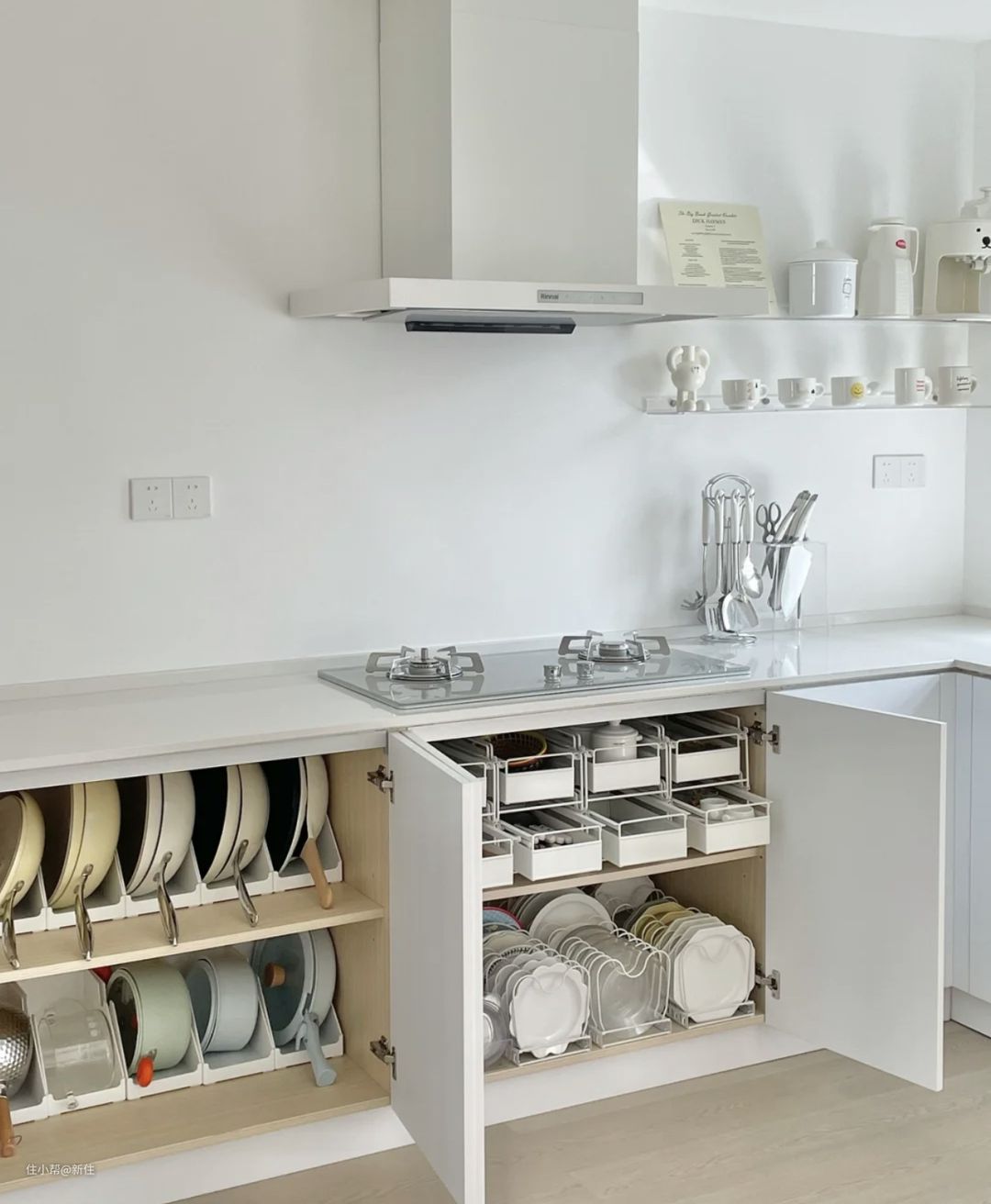 左边用橱柜收纳盒,将锅具统一摆放起来,收纳量大,还好拿好取;
