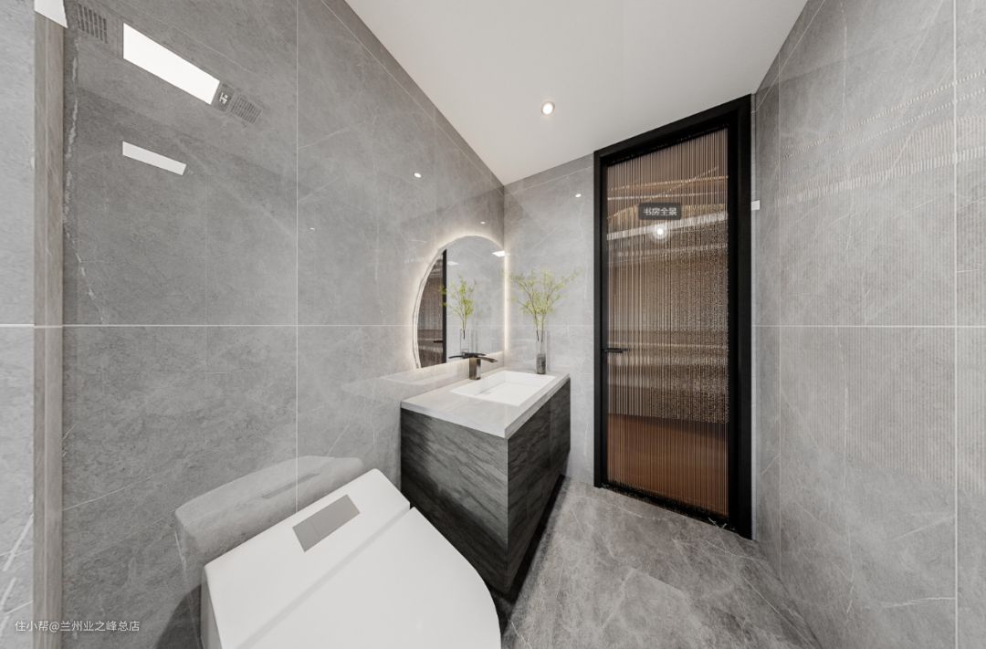 卫生间地面采用深色仿大理石瓷砖墙面采用AB面砖证明与背面砖不同,同时在浴室柜镜面照映出来交相呼应。顶面防水石膏板设计隐藏式暖风与换气设计。