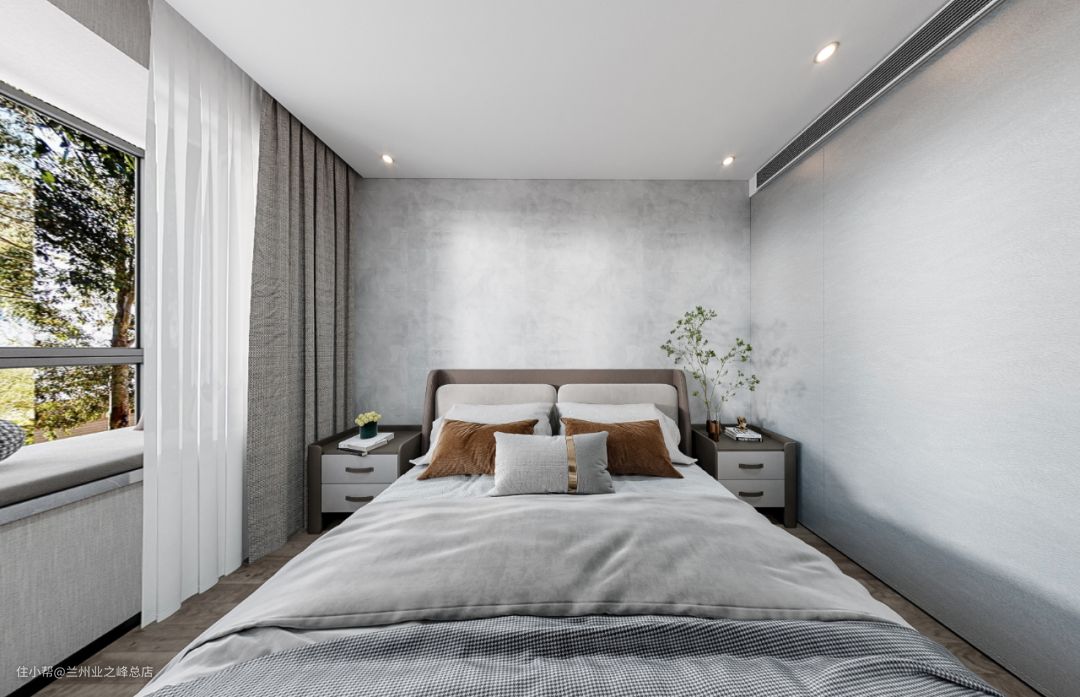 主卧色调统一,床背面用软包墙面采用护墙板与刷漆设计,旁面挂画设计地面地板通铺,顶面采用无主灯设计大量使用氛围光,大面积平顶简单大方。