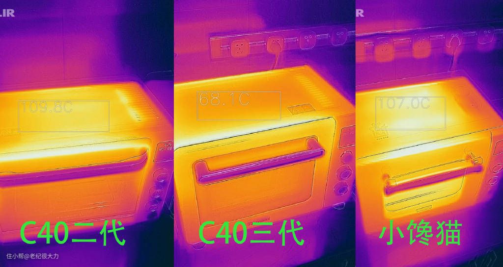 在测试时我也意外的发现有的烤箱顶部温度超级烫手,每台烤箱设置180度烧30分钟后,用热成像仪观察烤箱顶部的温度,发现C40二代和小馋猫的顶部温度都接近110度,而C40三代因为升级了5层隔热,温度只有不足70度,不容易烫手。