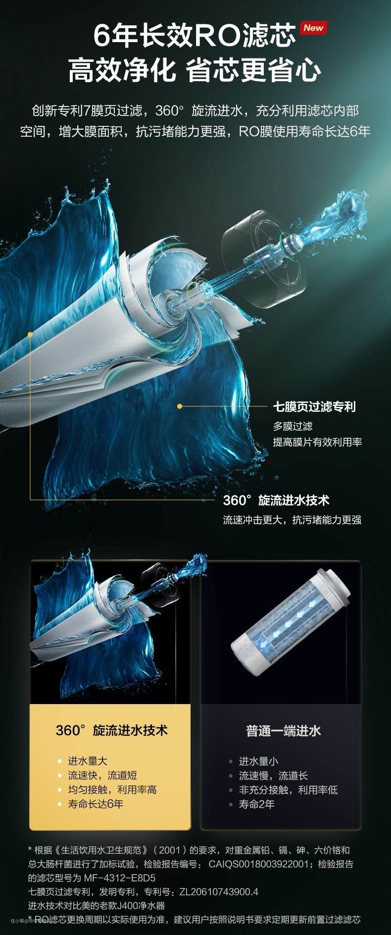 1200G的大通量,出水速度3L/min,比352略小了一点,但也算家用反渗透净水器的第一梯队,出水速度够快。7膜页过滤,360°旋流进水是特色技术,能充分利用滤芯内部面积,增强抗污堵能力,延长RO膜寿命。