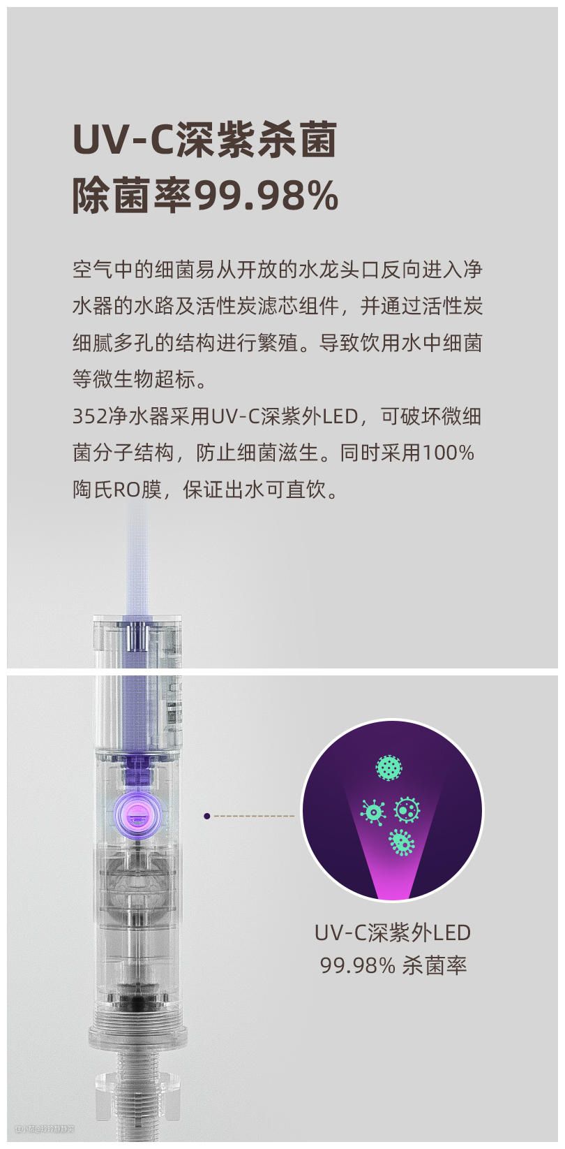 在龙头里添加了UV杀菌灯,防止龙头和水路滋生细菌,在RO膜低TDS可以直饮的理论基础上,通过UV紫外线杀菌,确保出水菌落总数不超标,满足了家庭不烧水直饮的需求,更容易说服家里老人让我和孩子们不烧水直接喝,真正实现母婴直饮。