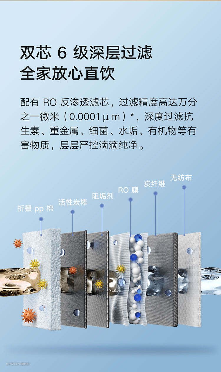 净水效果方面,双芯六级过滤,有RO反渗透滤芯,深度过滤抗生素、重金属、细菌、水垢、有机物等有害物质。