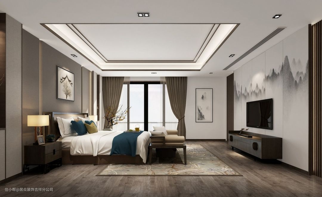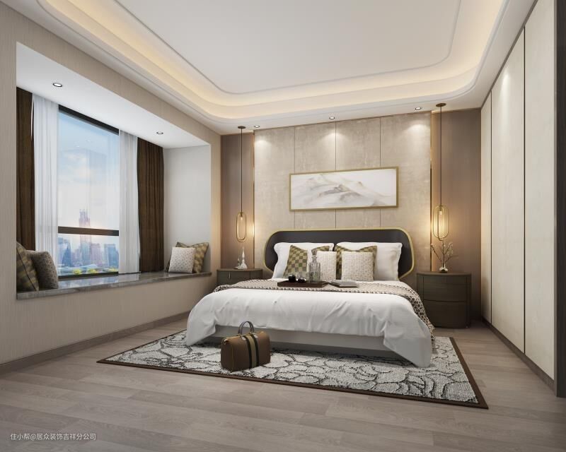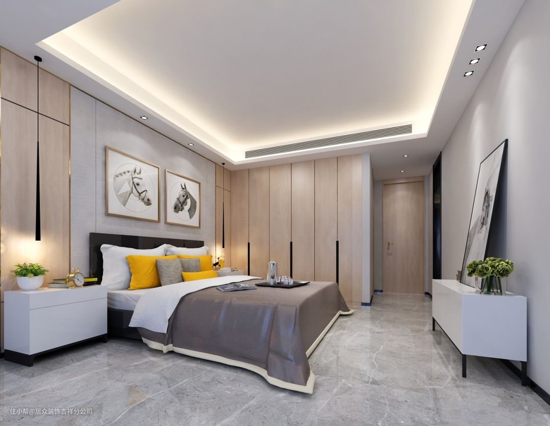 横幅装饰画的尺寸可以根据床的宽度去选择,一般比两侧床头缩进10cm即可。例如2米的床,床头背景墙就合适挂1.8米宽的横幅装饰画。挂画的高度可以结合空间与画面比例来选择,一般在50-70cm之间,根据装饰画的宽度来放大缩小。
