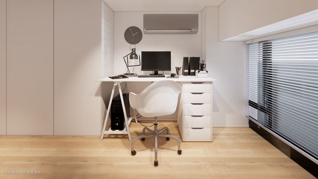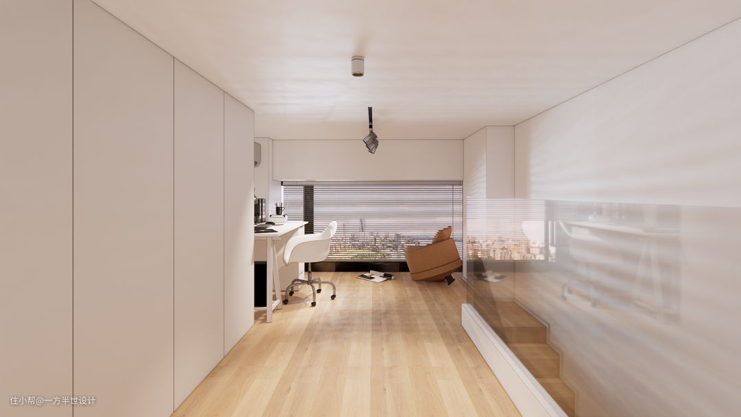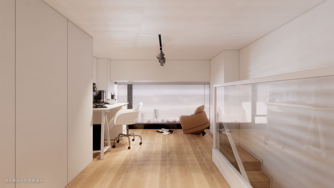 二楼楼梯上来是一个采光非常好的落地窗,书桌摆放在这边采光视野也是极佳