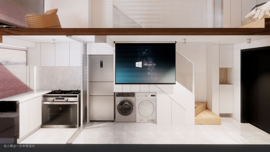客厅摆放今年比较流行的豆腐块沙发,冰箱洗衣机放置在楼梯下方节省空间的同时也不影响美观,一楼用升降式投影。