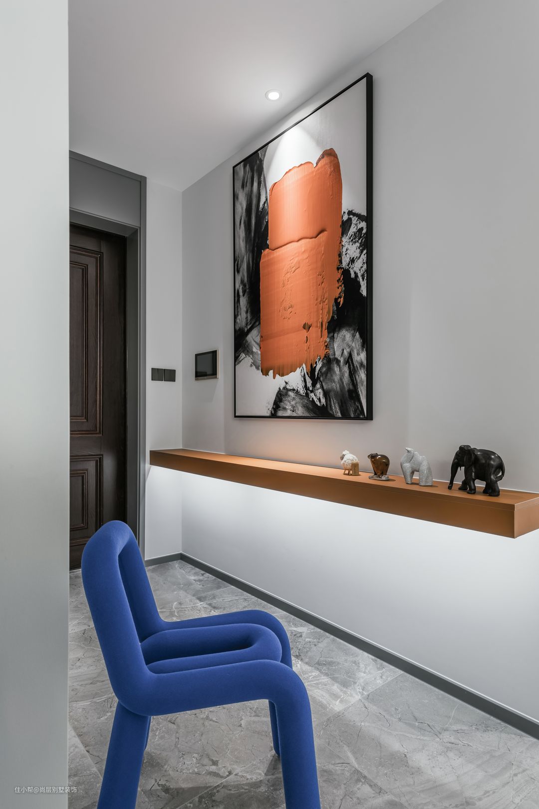 玄关也应该是客人进出门时停留的回旋空间,充分考虑到与整体空间的生活关系。这个入户门放置了一款大沙发,供来访者在此等待主人和换鞋休息。这个设计让玄关区域与会客区域有很好的结合性和过渡性,既有边界感又不失礼节。
