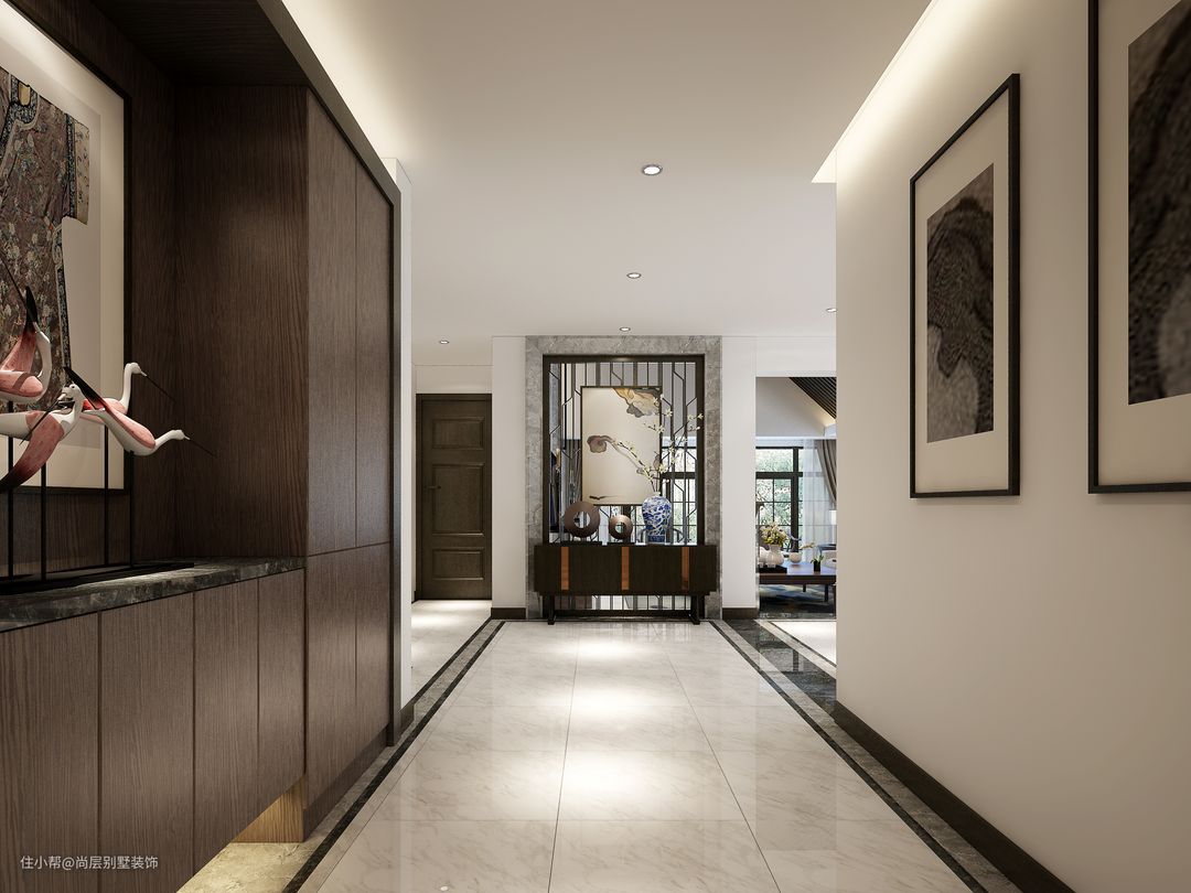 空间较大的入户门厅可以考虑利用起来收纳钥匙、鞋、伞、等物件。这个新中式风格的门厅在入户门处做了一排柜子,柜门无把手的设计利落统一,对应全屋风格具有很强的整体完成度。为了保持空间的私密性,玄关处做了一块隔断屏风,符合新中式"犹抱琵琶半遮面“的写意氛围。