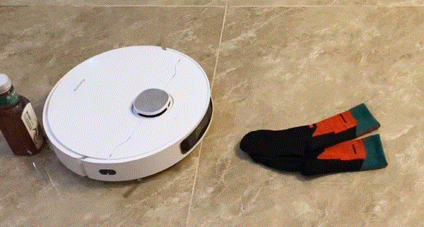 像体重秤、饮料这种没有危险的障碍物,它会最大限度的近距离清扫周边,但遇到袜子、数据线这种怕被缠绕的障碍物,它会自动降低边刷的转动频率,远远的绕开。
