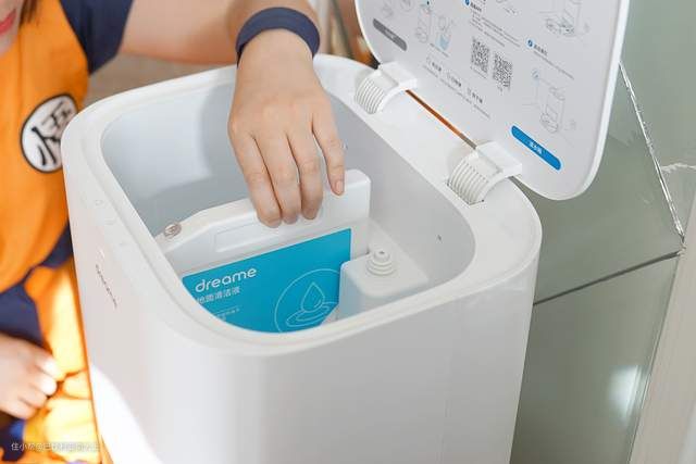 300ml的清洁液设计成薄薄的一瓶,插入在基站水箱中间的凹槽里,每次清洗拖布、给水箱补水时都会按精确配比自动添加,还会主动提醒剩余容量,这才是真正解放双手啊!