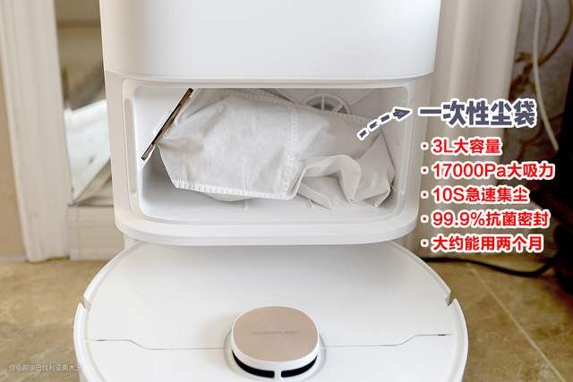 取下磁吸式封盖,3L的大尘袋一提封口,抗菌密封性达99.9%,灰尘完全不会漏出,彻底告别频繁倾倒尘盒的麻烦。
