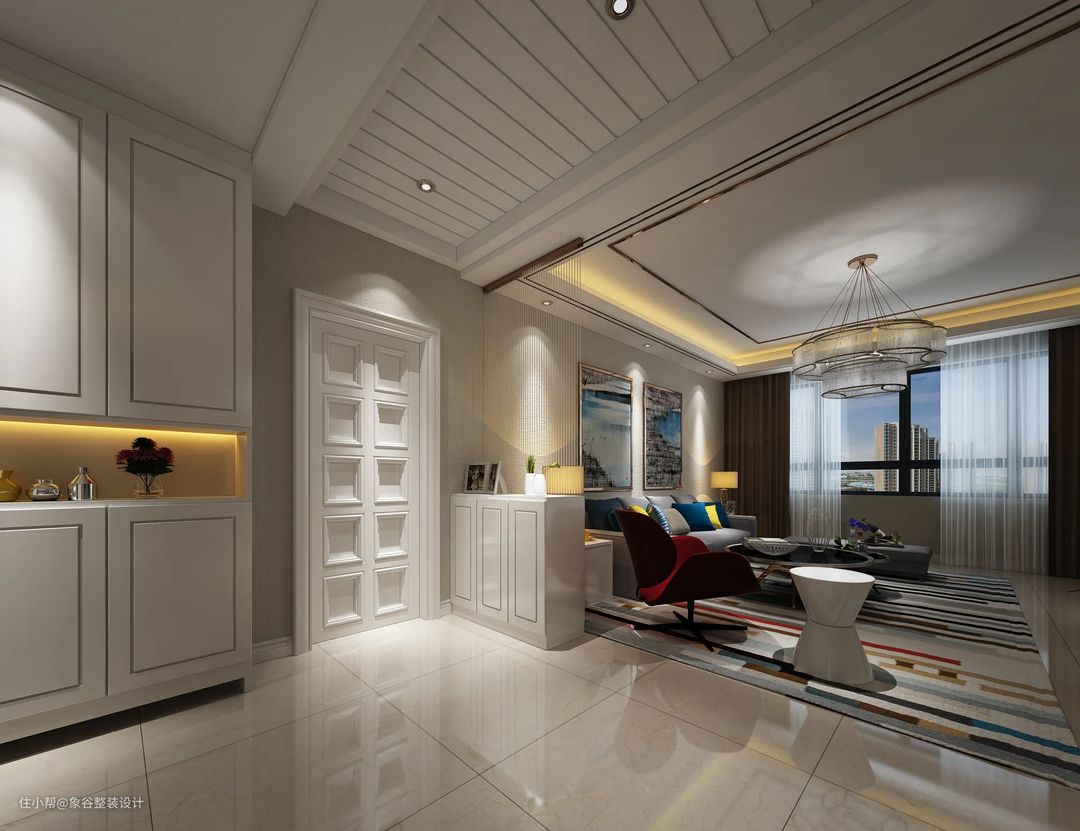 以鞋柜为主体,在上方使用单头或多头吊灯,然后搭配一些装饰画、花艺以及小饰品等装饰玄关,这些装饰品高低穿插组合后,就将玄关区打造成立一个具有艺术感的展示区。