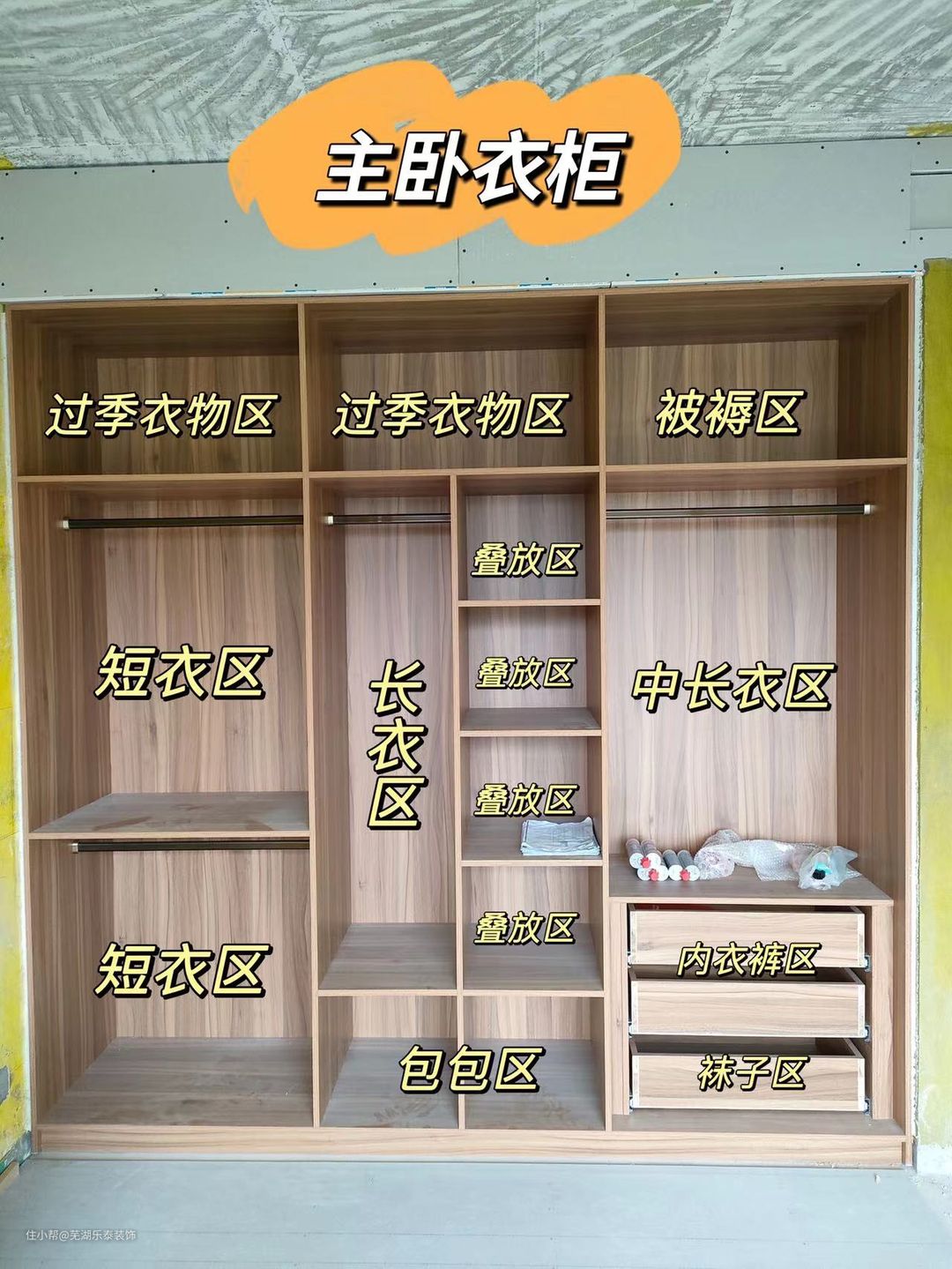 抽屉区:抽屉可以多预留几个,用来叠放一些打底衣物和收纳内衣裤、袜子等小件衣物。