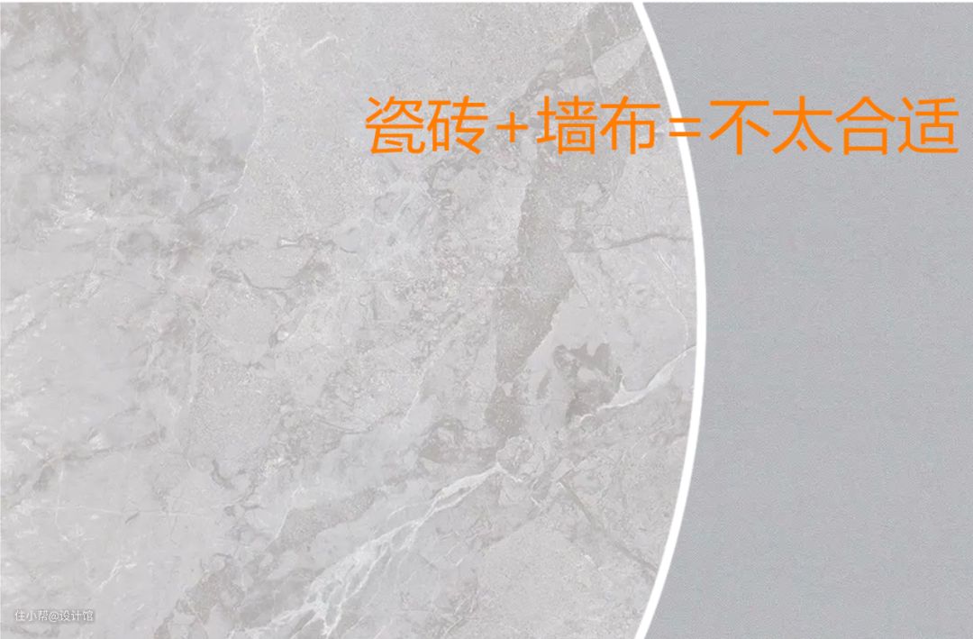 墙纸墙布与瓷砖,一般来说比较少人会把他们装到同一面墙上,因为这两种材料的衔接收口有个bug——先贴墙纸墙布,贴墙砖的时候容易弄脏墙纸墙布;先装墙砖与收边条,墙纸墙布就不能被收边条压住,边边还是容易翘边。