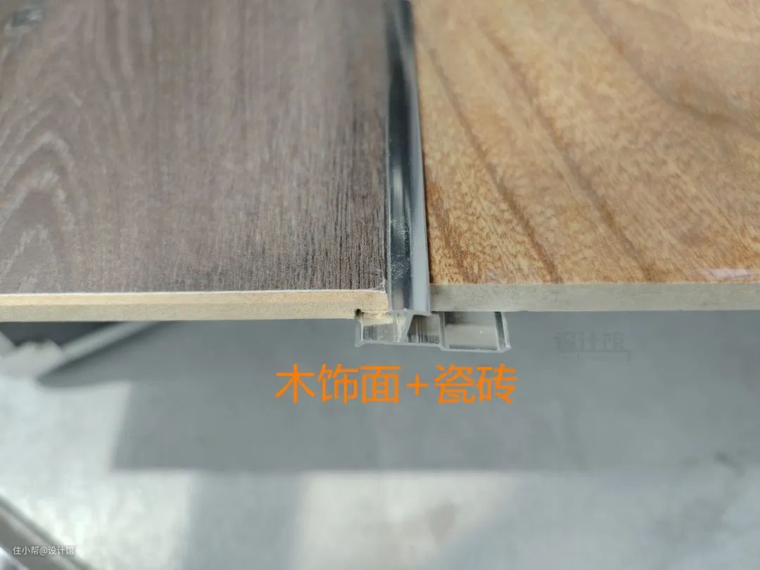 瓷砖与木饰面安装在墙面的时候都是会凸起的,因此这两个材料的安装衔接,可以考虑在中间加入金属条来收口,具体采取什么形状的收口条,可以根据瓷砖与木饰面的厚度,根据现场情况来选。