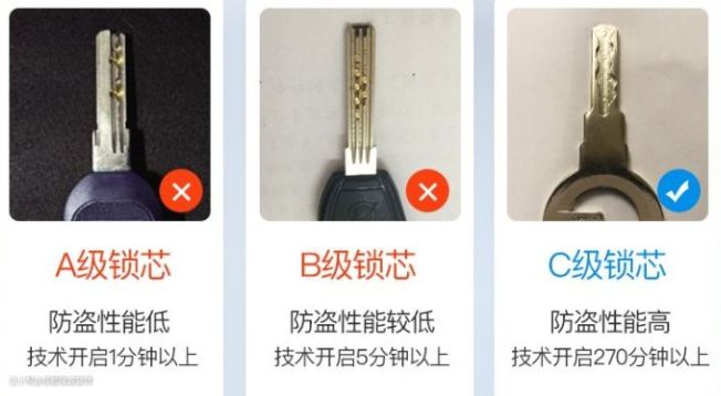 A级锁技术开锁时间不到1分钟,B级锁需要5分钟以上,而C级锁开锁时间,理论上需要270分钟以上。