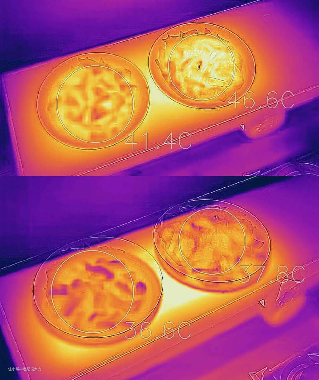 上面是刚放上保温台时两盘菜的温度,摆上时菜就已经只是温热,只有40多度。下面是在保温台上放了45分钟后菜的温度,两盘菜分别只降低了5-8度,依然还是温热状态。像红烧肉这种食物如果放凉了才端上桌,我想就没什么人会想吃了,保温台的效果还挺明显的。如果把刚炒出来的菜直接放在上面,保温效果也会更好。