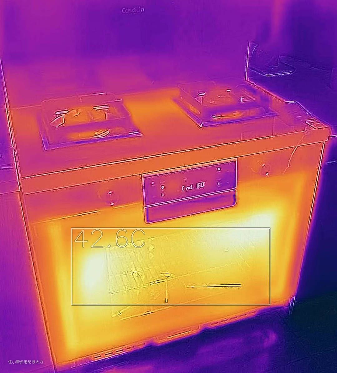 180度连续加热30分钟后,用热成像仪测得烤箱面板的温度只有42度,这是因为凯度G1E采用了烟机烤箱联动,烤箱启动后烟机会自动低速运行,并用冷风置换走面板内的热度,这样长时间加热的烤箱也不会把厨房变热而且不会意外烫到小朋友。