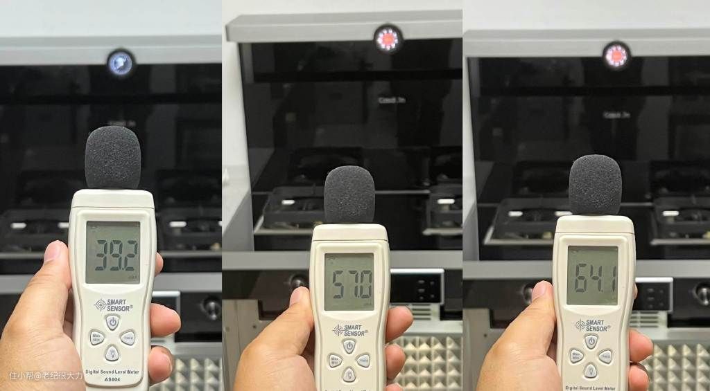 最后我们再看一下烟机工作时的室内噪音吧,下图三个音量从左至右分别是未开启烟机、烟机低速和烟机最高速模式时的噪音分贝值。我家一楼临街所以平时的声音就比较大,日常室内就有40分贝左右。风机开启低速模式后的室内分贝值在57左右,开到最高速时室内分贝值也只有64,并不算高,噪音控制做的还是可以的。