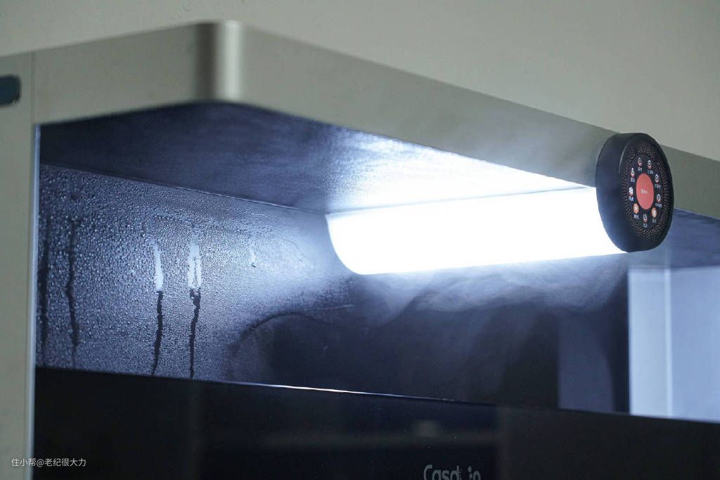 这里值得一提的是凯度采用了直喷式的蒸汽发生装置,即水在管路里直接被加热成蒸汽喷到腔体内,烤箱底部的蒸发盘是辅助加强蒸汽和烘干腔体用。而低价的蒸烤箱采用的是煮水式产生蒸汽,即用泵把水抽到烤箱底部的加热盘里,水在加热盘里被煮沸产生蒸汽。煮水结构比较简单造价低,但是很容易留下难以清理的难看水垢,而且蒸制食物后底部留有非常多的积水,不如直喷式的先进和好用。