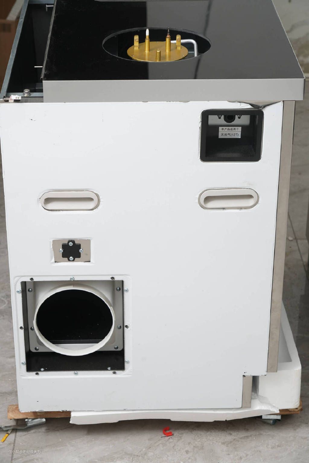 集成灶的安装服务也很好,我在网上预约了以后很快就有电话和我安排具体的时间,整个安装过程也很简单,没有什么复杂的改造工作。趁着师傅准备的时候,我还特意打开看了一下灶头。和我想象的使用软管+两个气孔的老灶具完全不一样,这款集成灶的空气、天然气进气都是金属的管道,紧紧地固定在灶头上,看起来很安全。