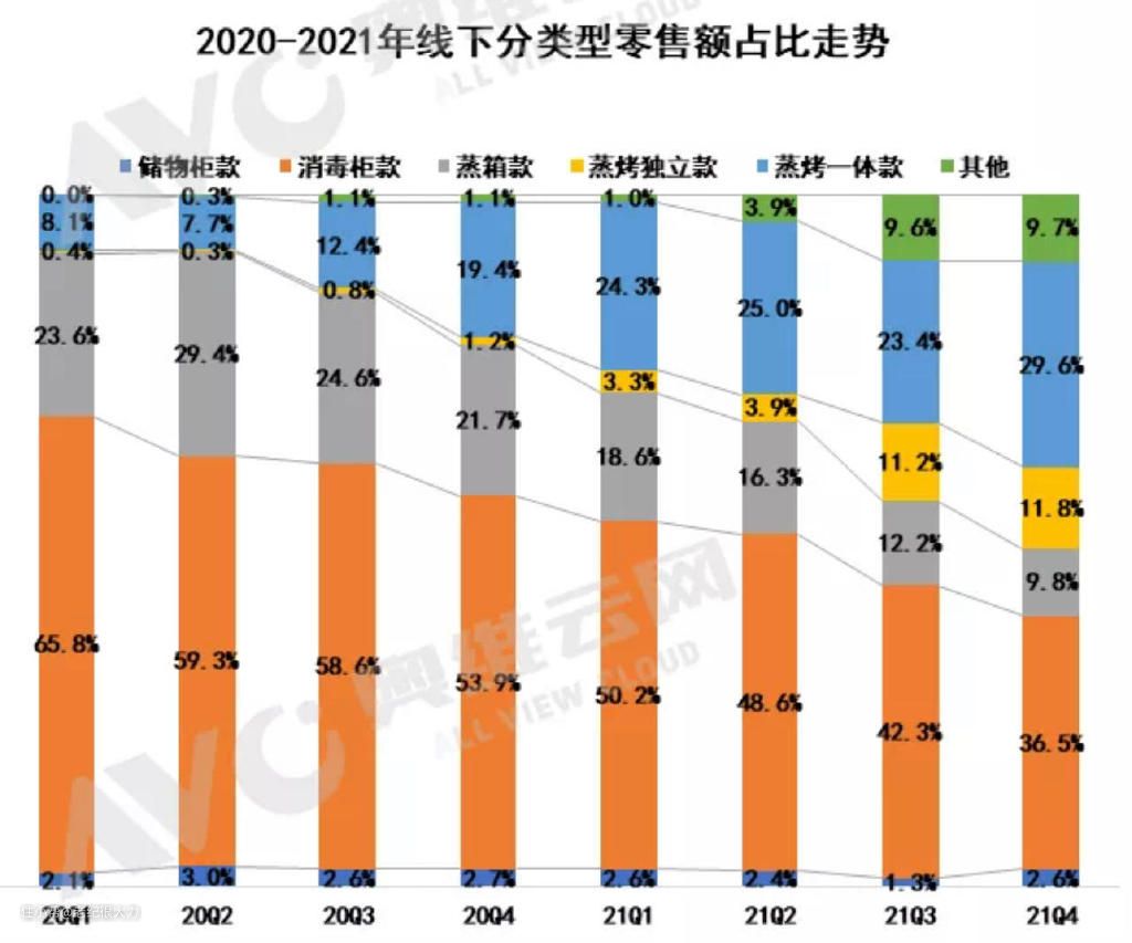 第三个模块有很多选择:蒸箱、烤箱、蒸烤箱、消毒柜、储物柜等。现在消毒柜和储物柜类的基本已经被市场淘汰了,大家直接pass就可以。在纯蒸、纯烤和蒸烤箱模块中,选择蒸烤一体模块的用户增长速度快,是未来的趋势。根据互联网信息提供商奥维云网给出的信息,可以看到蒸烤箱款的集成灶每年的销售占比都在变高(蓝色的块),选择蒸烤模块就没错啦。