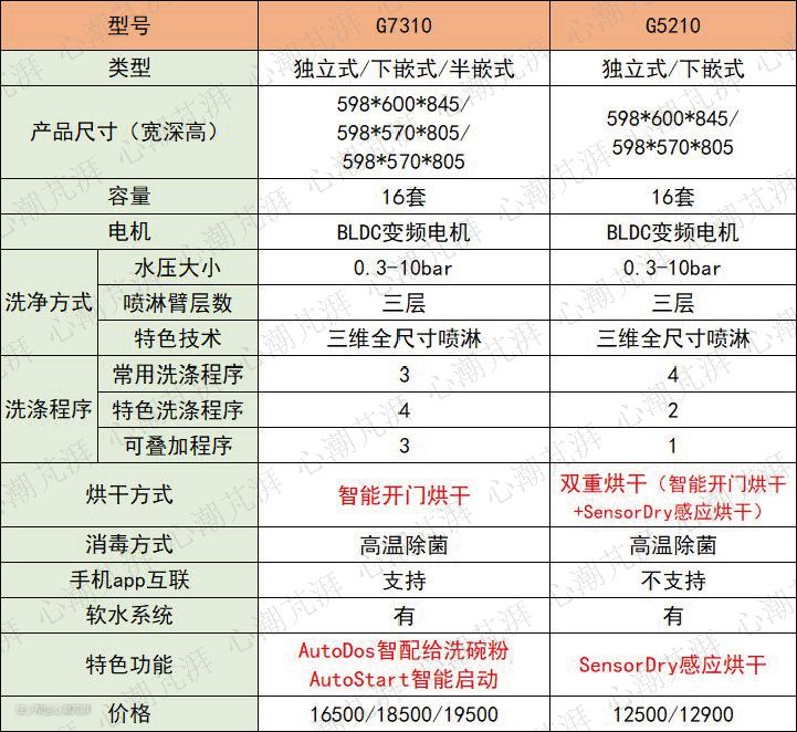 美诺算是洗碗机领域的奢侈品,德国进口,价格较高,适合不差钱的小伙伴。线上售卖的型号主要有两个系列:G5000系列和G7000系列,其中G7000系列要比G5000系列高端,这里介绍两个系列里比较畅销的款,型号参数对比如下:
