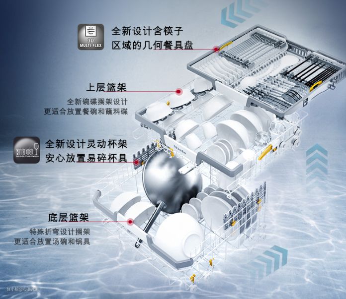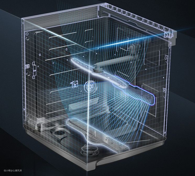 ▲洗碗机洗涤方式可分为:涡流式、喷淋式和超声波式,市面上大多数家用的都是喷淋式的,清洗效果更好,能做到 360°、甚至是 720° 无死角冲洗。选购的时候尽量选择摇臂多以喷头覆盖全面的,但是也不是喷头越多越好,容易分散水压。