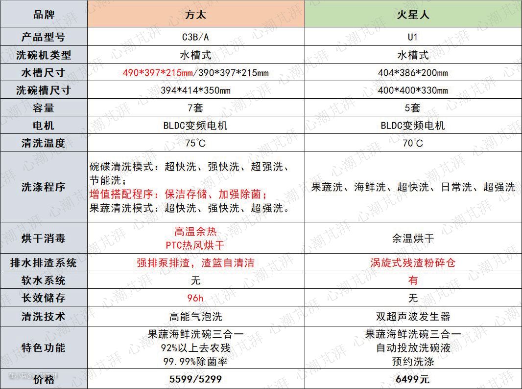 ▲作为水槽式洗碗机的发明者,方太在这一领域比较具有代表性。随后华帝、火星人等品牌相继在这个领域推出自己的产品,也有的做的还不错,下面推荐两款产品,先放参数表格: