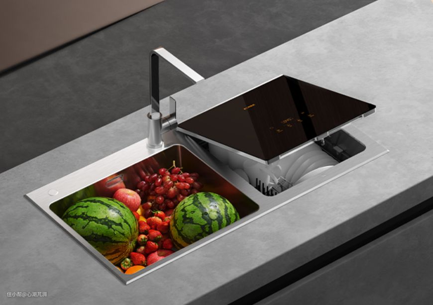 ▲水槽式洗碗机的水槽和洗碗机是一体化的, 不仅可以洗碗,还可以洗菜,洗水果等。市面上多数水槽式洗碗机都有除菌清洗的功能,而且购买水槽式洗碗机的话,就不用担心橱柜尺寸不符了,也不用考虑占用面积是不是太大。但是水槽式洗碗机的容量比较小,没有办法洗炒锅一类的大厨具,价格也相对较贵。