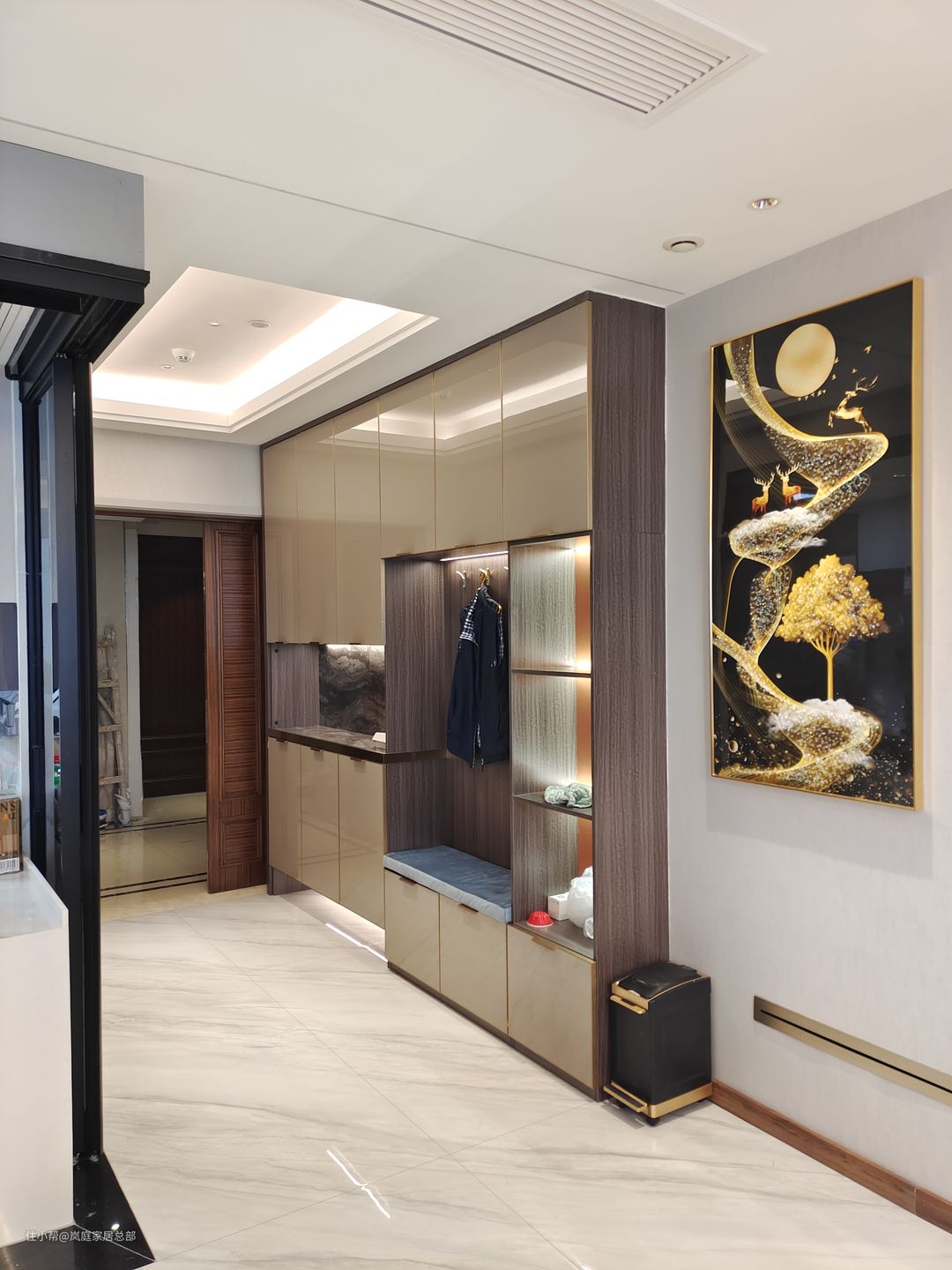 玄关柜做了顶天立地的款式,很好的增加收纳,还免去打扫柜顶的烦恼。咖色的柜面带有反光的特性,可以映照出室内的光影图案,让小空间更显宽阔,还很有质感。