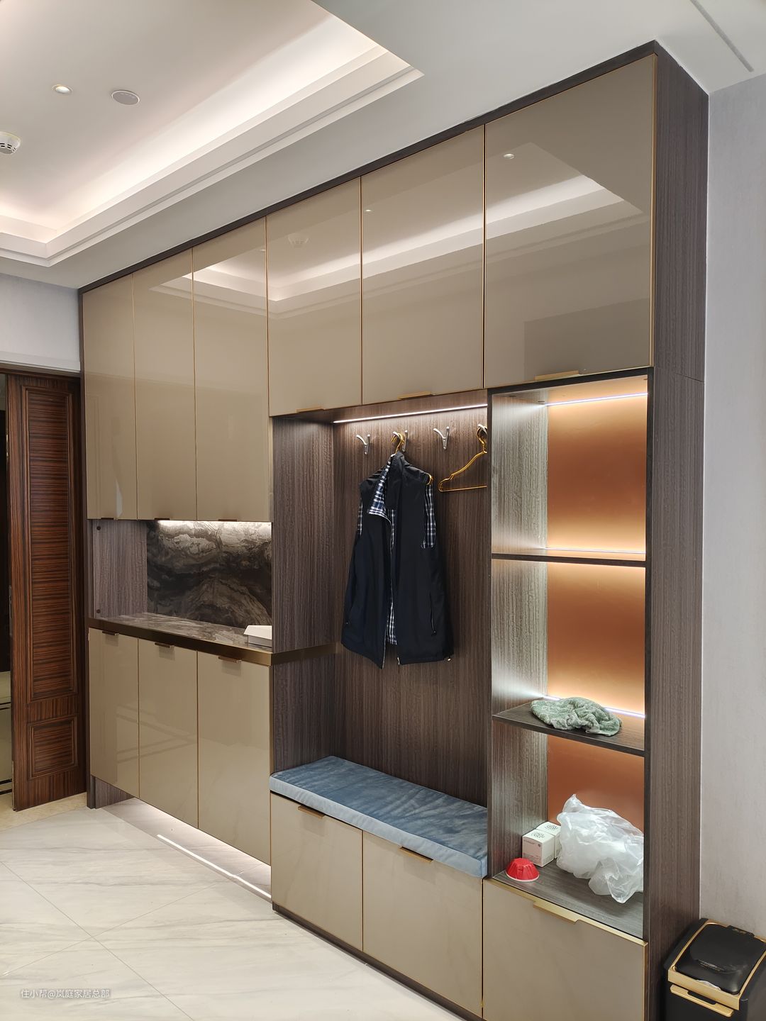 最喜欢的是玄关柜最右侧的区域,加入橙色元素,直接为空间注入活力,且开放式隔间+LED灯,只要摆放上漂亮包包或摆件,就是个小型展示区了。