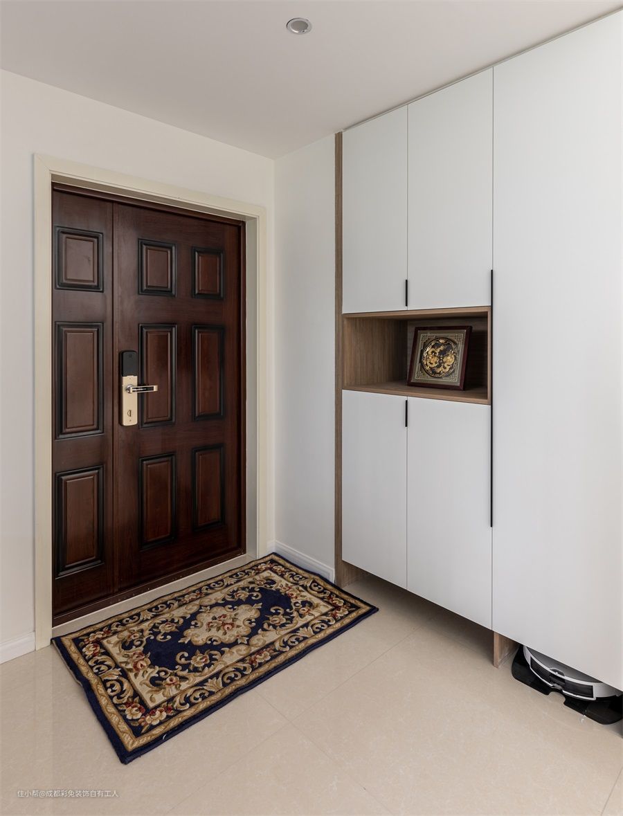 利用了进门左边的墙壁打造了一小片定制柜,柜体左边用来换鞋、放鞋,镂空的地方用来放钥匙,柜体右边当做储物柜,可以放一些反季的被褥,并且底部镂空处预留了插座,方便扫地机器人充电。