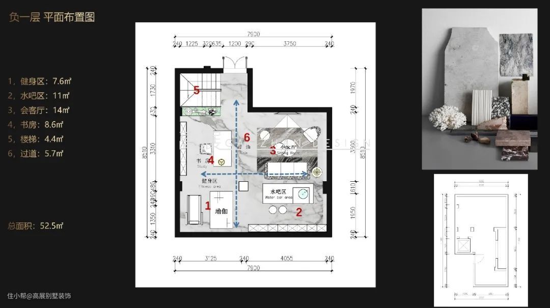 第二稿方案将地下空间重新规划,更加多功能化。设计师将地下空间规划为会客厅、水吧台、瑜伽健身区和书房。要赋予地下室丰富的功能,在设计上地下室的空间处理原则尽量是大开间,除了局部空间外,地下室要打开做混合共享型的功能才更有气势感。