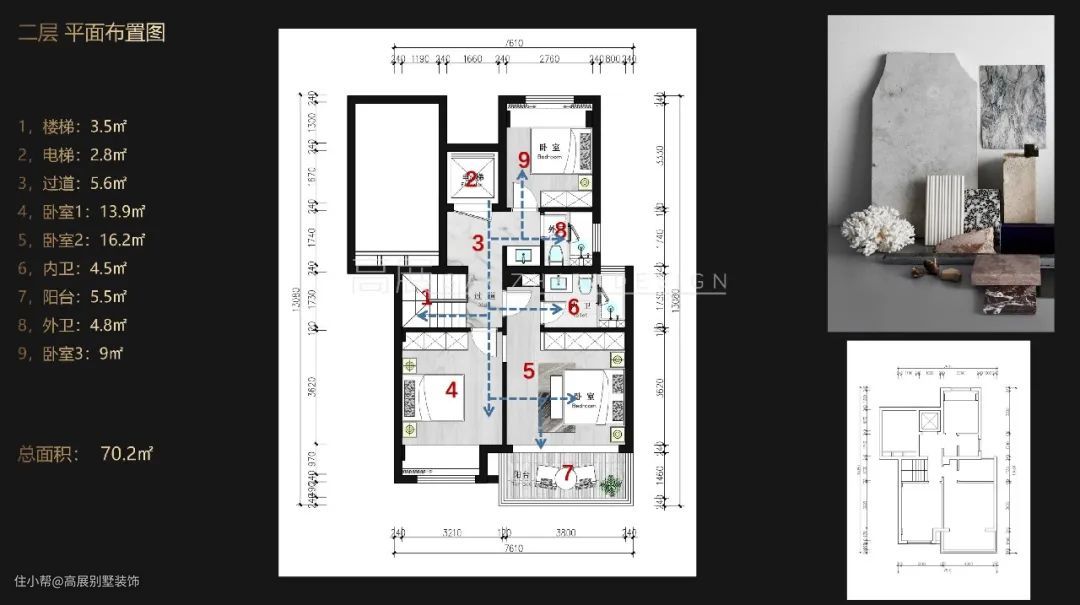 二层为居住空间,包含主卧套房、儿童房和父母房。主卧空间作套房设计,包含睡眠空间和盥洗室,放置到顶的衣橱来增加更多的收纳,也可以做成步入式衣帽间进行过渡。
