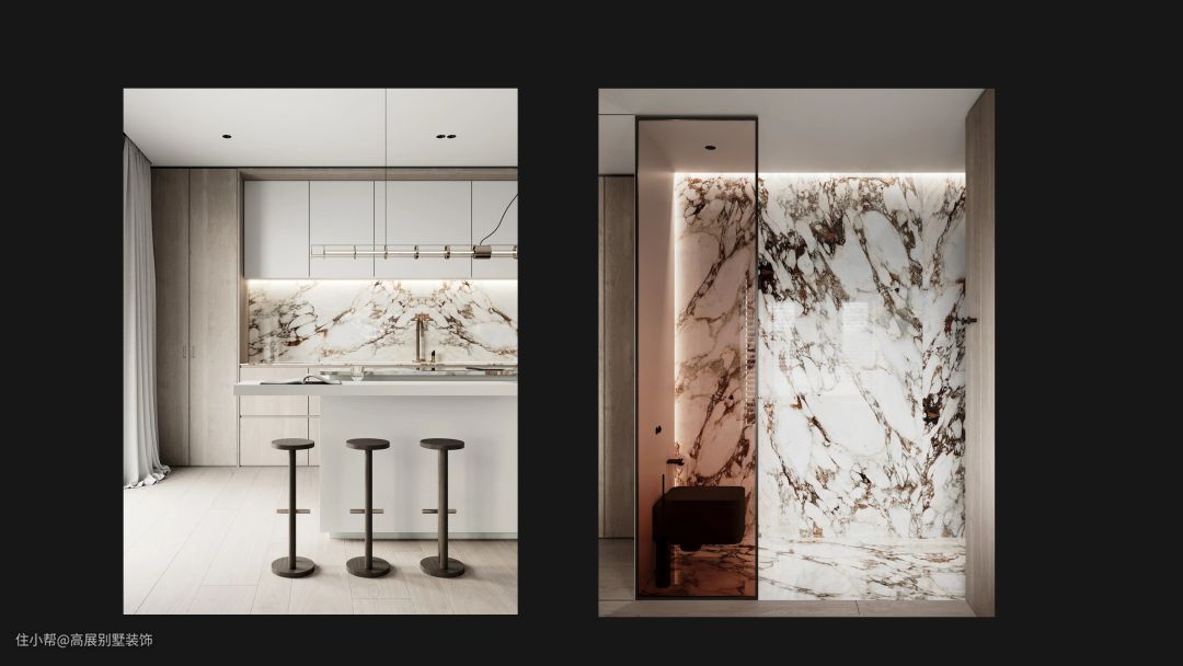 客厅、餐厅、厨房之间是连接贯通的,这种完全开放式的格局能让光线和风都畅通无阻地进入室内,增强空间的通透感;并能够大大提高空间的利用率,解决空间功能不足的问题;餐桌更贴近厨房,像择菜洗菜等工作都可以在餐桌上完成,从客厅到餐厅也只有一步之遥,大大缩短了生活动线,非常方便。最大的好处,就是构建了一个利用率超高的家庭核心区。