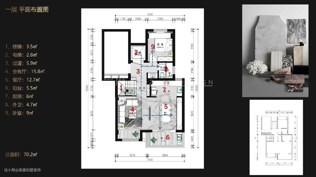 一层为主要生活起居空间,设计师将这层空间规划为开放式客餐厨以及北卧室。
