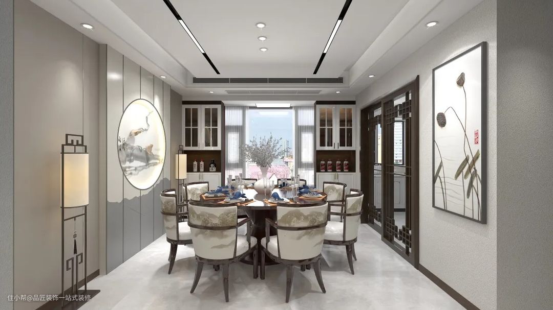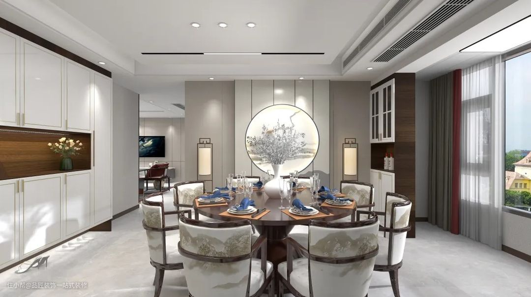 客餐厅之间,仿照传统屏风做了样式典雅的半隔断。餐桌椅的选择上也注重融入中式元素。对于注重生活品质的现代人而言,日常的用餐也不能忽略氛围感。