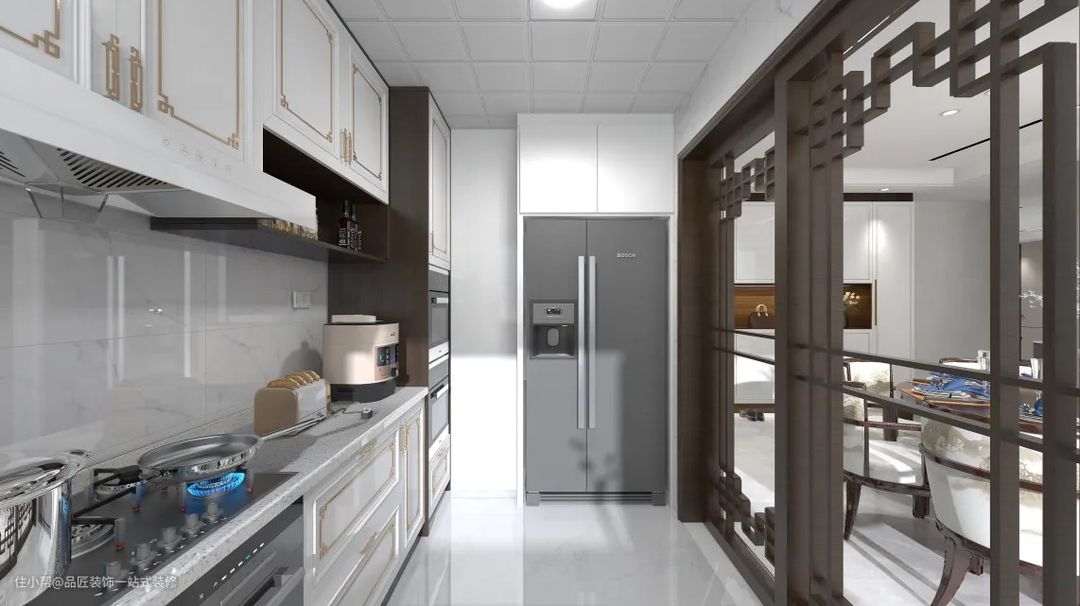 饰以金线的多层橱柜,充分保证收纳空间的同时提升了厨房的格调。洗手作羹汤时,也可以有出尘气质。
