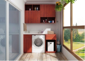 阳台照明安装在室内更方便;还需在墙面低处预留两个三孔带开关的插座,洗衣机与烘干机用完即可关闭电源。