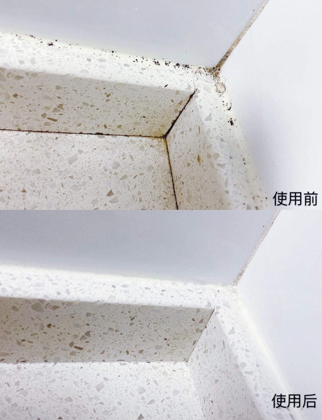 其实这两条发黑的缝隙,并不难清洁,除霉啫喱一抹,第二天就消失不见,用好一点的玻璃胶,清除一次用一年半载并不会发霉。
