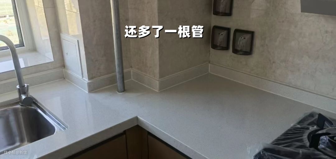 更糟心的是,蕙蕙同学正式拿到自家房子的时候,切菜区还多了一根管子,如果要包,就更显局促了。