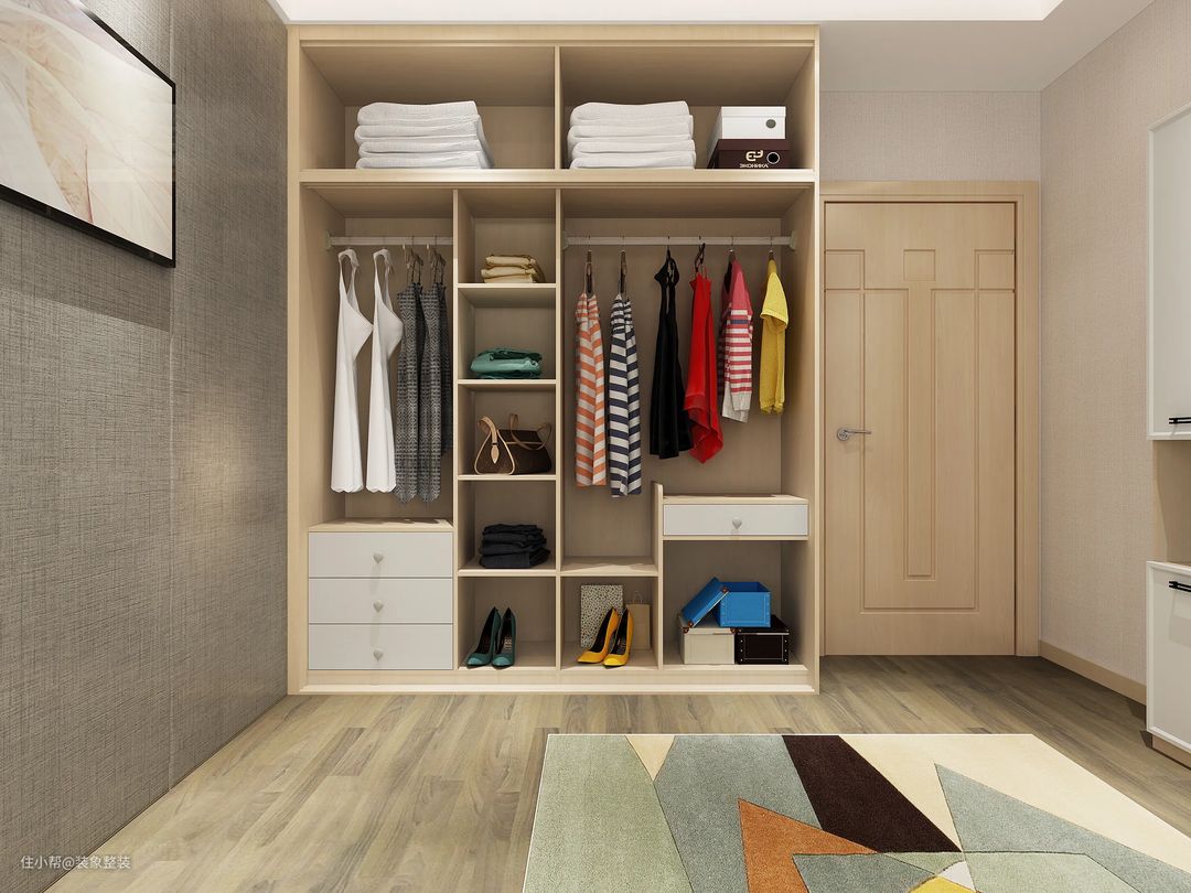 年轻夫妇:年轻夫妇的衣物较为多样化。长短挂衣架、独立小抽屉或者隔板、小格子这些都得有,便于不同的衣服分门别类地放置。