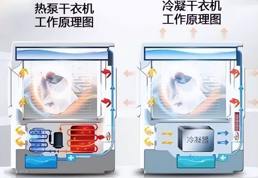 ▲热泵干衣机的工作原理是利用热泵压缩减压放热,一头吸收衣物中的空气余热并去除水分,变成干冷空气;另一头吸收余热压缩成更高热量,然后在高能区释放热量,形成干热空气。烘干机内有旋转内筒,通过皮带驱动,干热空气缓缓吹过内筒,达到干燥的目的。