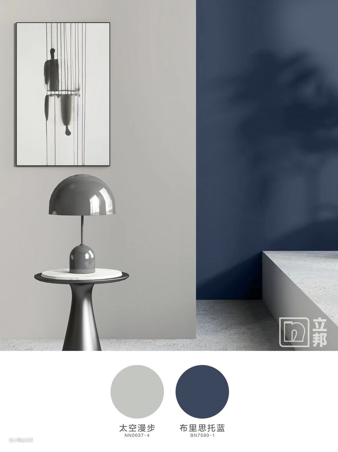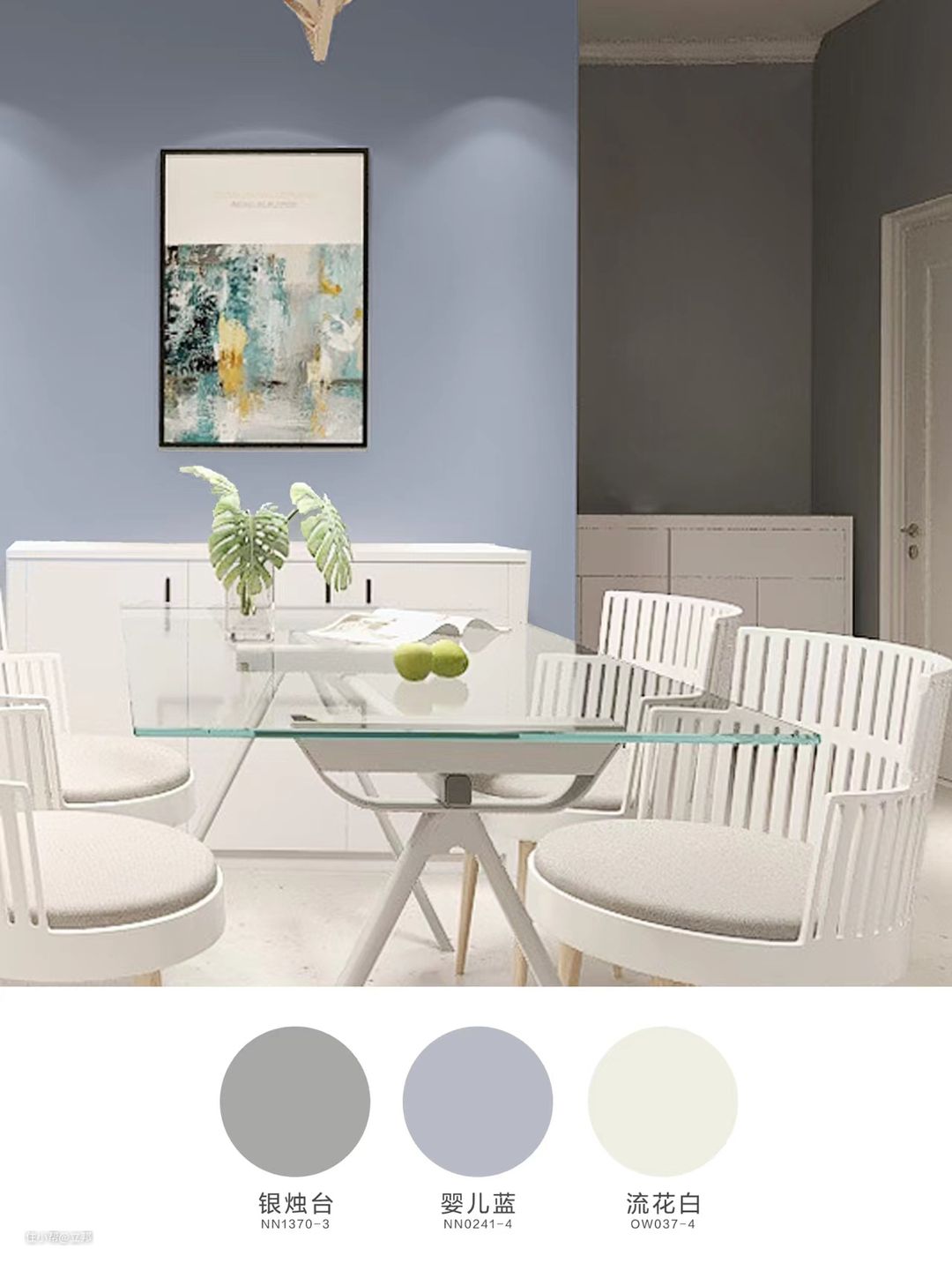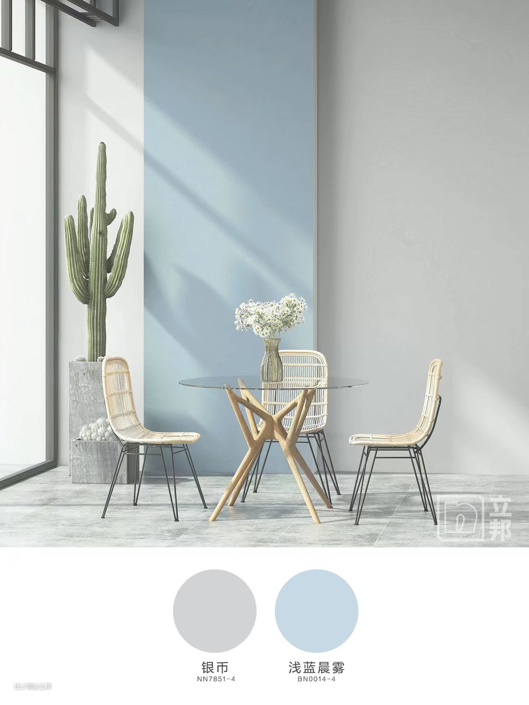 立邦色彩NN7851-4银币是饱和度较低的灰色,浅蓝晨雾浅高级而雅致,浅灰色与浅蓝色温柔碰撞,温和又清爽,显得整个空间明亮宽敞,包容又治愈,让人身心格外的放松,心情愉悦。点缀上一些绿植,一抹春色把大自然赋予的生机饱满地释放出来,清新浪漫的氛围一触即发。